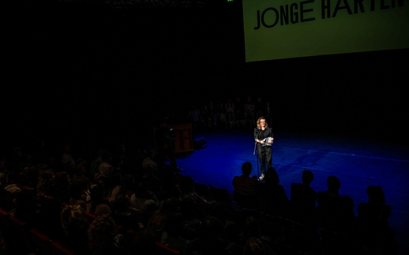 En ergens. Iemand moet ergens beginnen. Laten we dat nu maar doen dan. Vanavond beginnen we aan negen dagen Jonge Harten festival. Editie 2022. Een festival voor jong publiek, met moedige makers, een briljant festivalteam en ongelooflijk genereuze partners. Waaronder het Grand Theatre en NITE. Al deze mensen achter mij leveren een bijdrage, niet alleen vanavond maar het hele jaar door en zowel voor als achter de schermen in een sector die zichzelf moet heruitvinden na een hele lange periode van overleven, uitstellen, op de rem staan, en afstand houden.