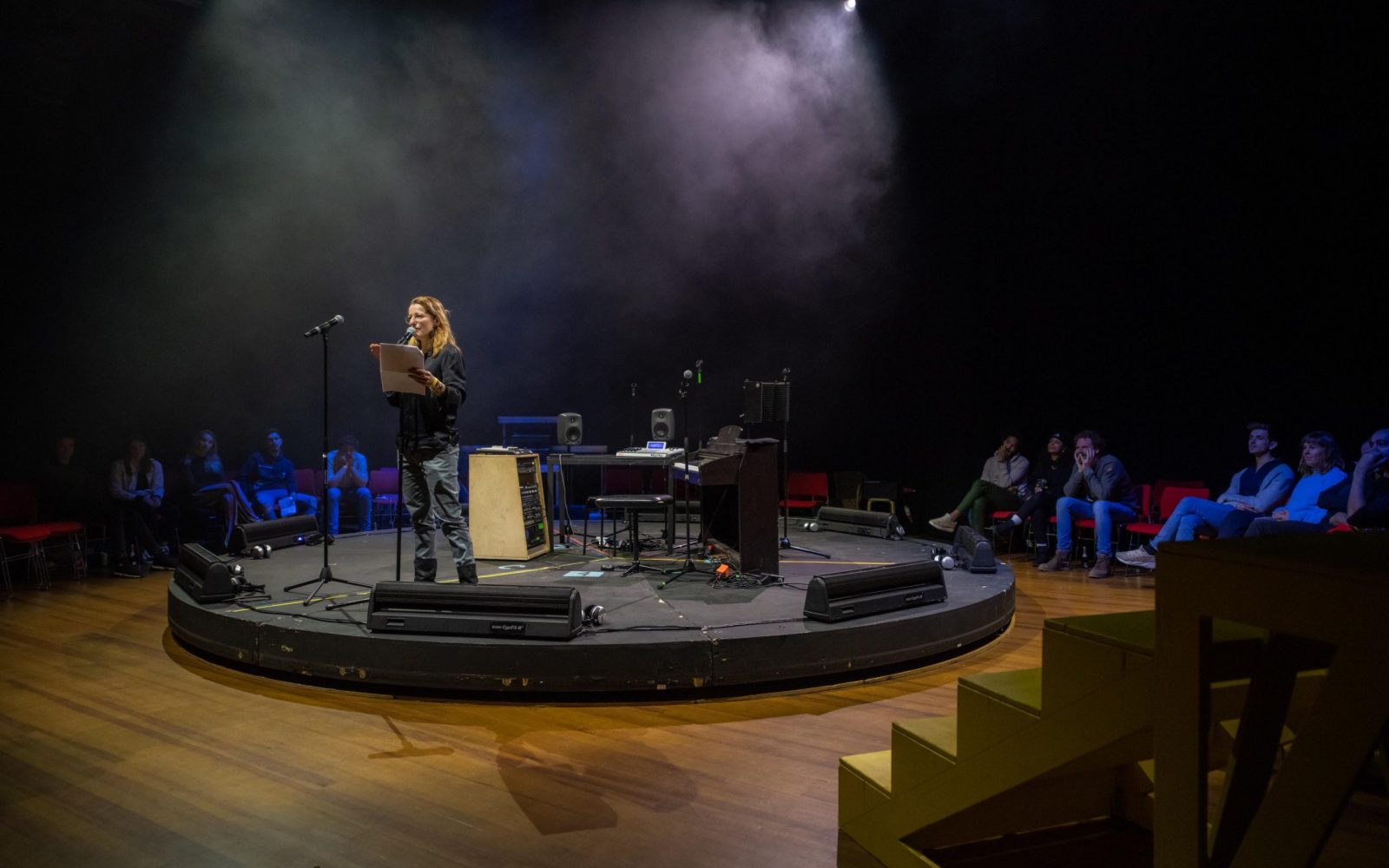 En dan nu, deze editie. Future is coming. Vroeger dacht ik dat de toekomst iets was dat ver weg lag. Iets dat alleen in mijn verbeelding bestond. Toen ik 8 was heb ik een tekenwedstrijd gewonnen met twee planeten hangend in de lucht waarvan er 1 ontploft was en wij als mensen naar een tweede waren verhuisd. Hoe weinig vertrouwen ik blijkbaar had in de mensheid, zoveel vertrouwen kreeg ik van mijn vader en moeder. Ik wilde altijd alles net iets anders, en nooit is me dat door hen verboden, ook in mijn liefdesleven ontmoette ik een man die naast mij staat ook al pas ik soms niet in een plaatje. Dank Mats. Ook in mijn werkende leven ontmoette ik de juiste en genoeg mensen die vertrouwden op dat ik iets kan, waardoor ik hier durf te staan. Nu. Veel zijn hier vanavond aanwezig, waarvoor dank. En ook dank aan mijn bestuur…. dat ze vonden dat ik dit mocht proberen. Vertrouwen en mogen proberen zijn wat mij betreft de bouwstenen van het festival richting jonge makers en publiek. Kom dat alsjeblieft bij ons doen de komende jaren. En veel op je bek gaan, en dan terugkijken en het nog een keer doen.